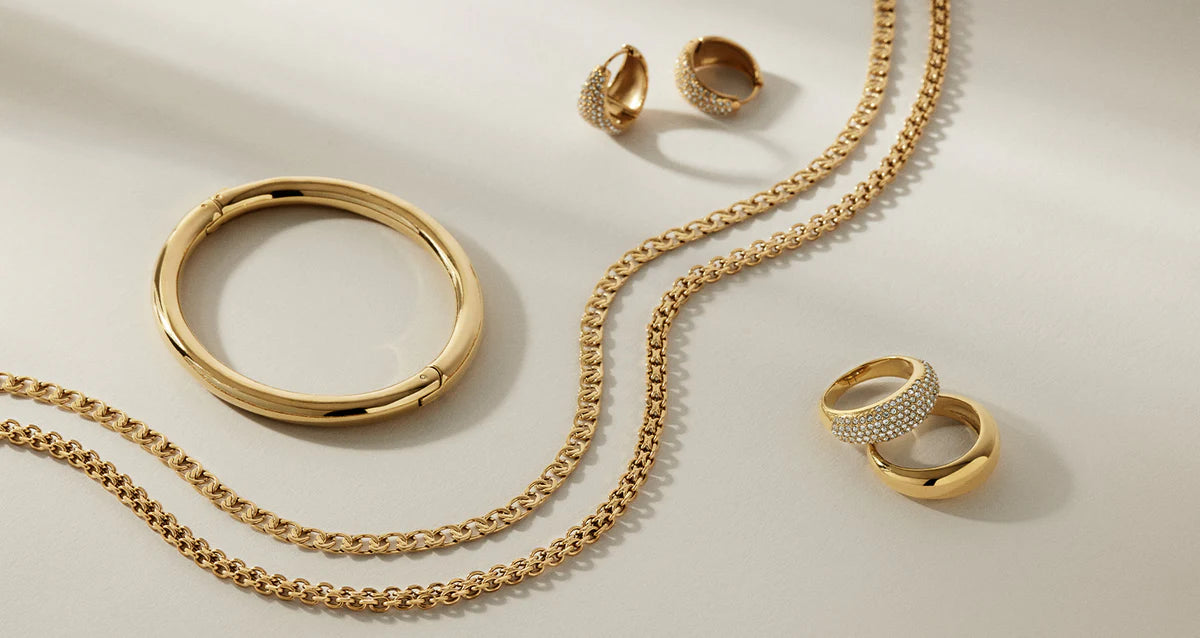 Upptäck dragningskraften hos våra guldsmycken, där sofistikering möter modern design